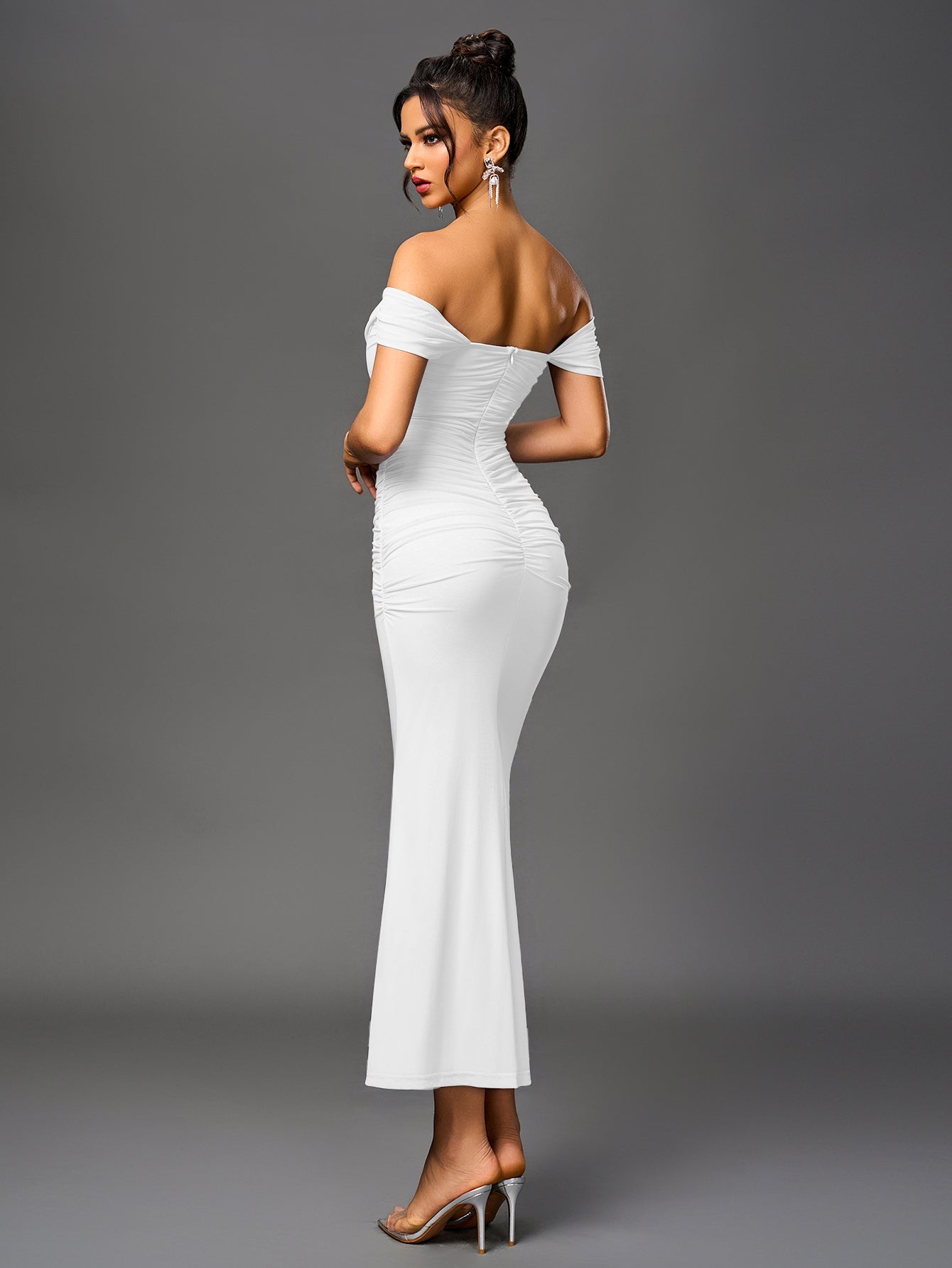 Ta elegancka sukienka z odkrytymi ramionami to idealny strój na uroczysty wieczór. Połączenie marszczenia, wysokiego stanu i dopasowanego kroju stylowo podkreśla kobiece kształty. Miękka, elastyczna siateczka zapewnia wygodę i pewność siebie, a dół o kroju syreny tworzy szykowną, zwiewną sylwetkę. Niewidoczny zamek błyskawiczny z tyłu dopełnia całość, nadając jej elegancki, wyrafinowany wygląd.