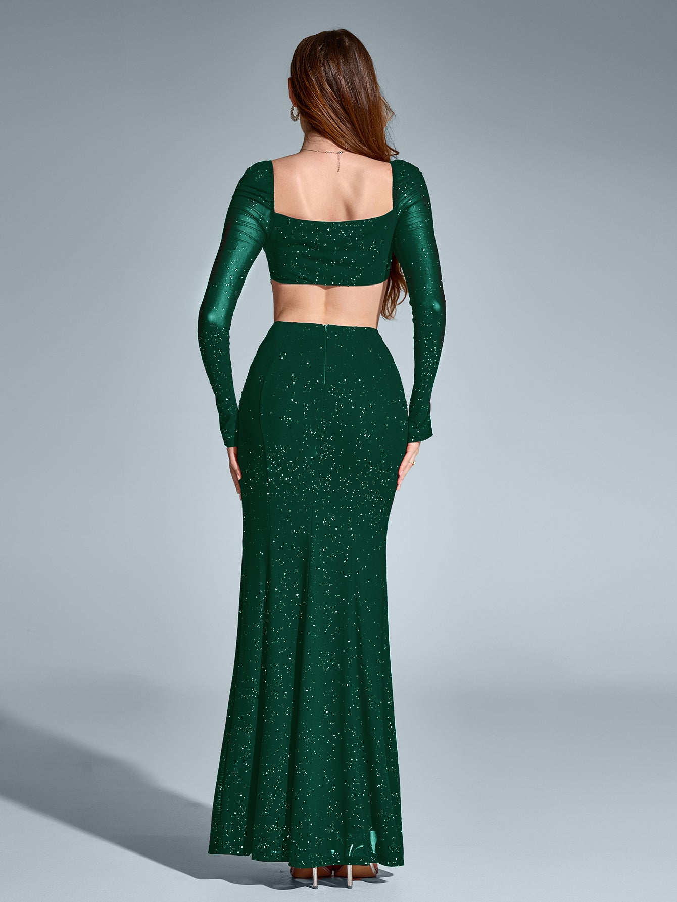 Skorzystaj z uwagi na swoim słuchaniu w tej olśniewającej sukience maxi. Wykonanie z siateczki z cekinami, z dramatycznym wycięciem i bez dopasowania, ma dopasowany krój, który łączy glamour z wyrafinowaniem.