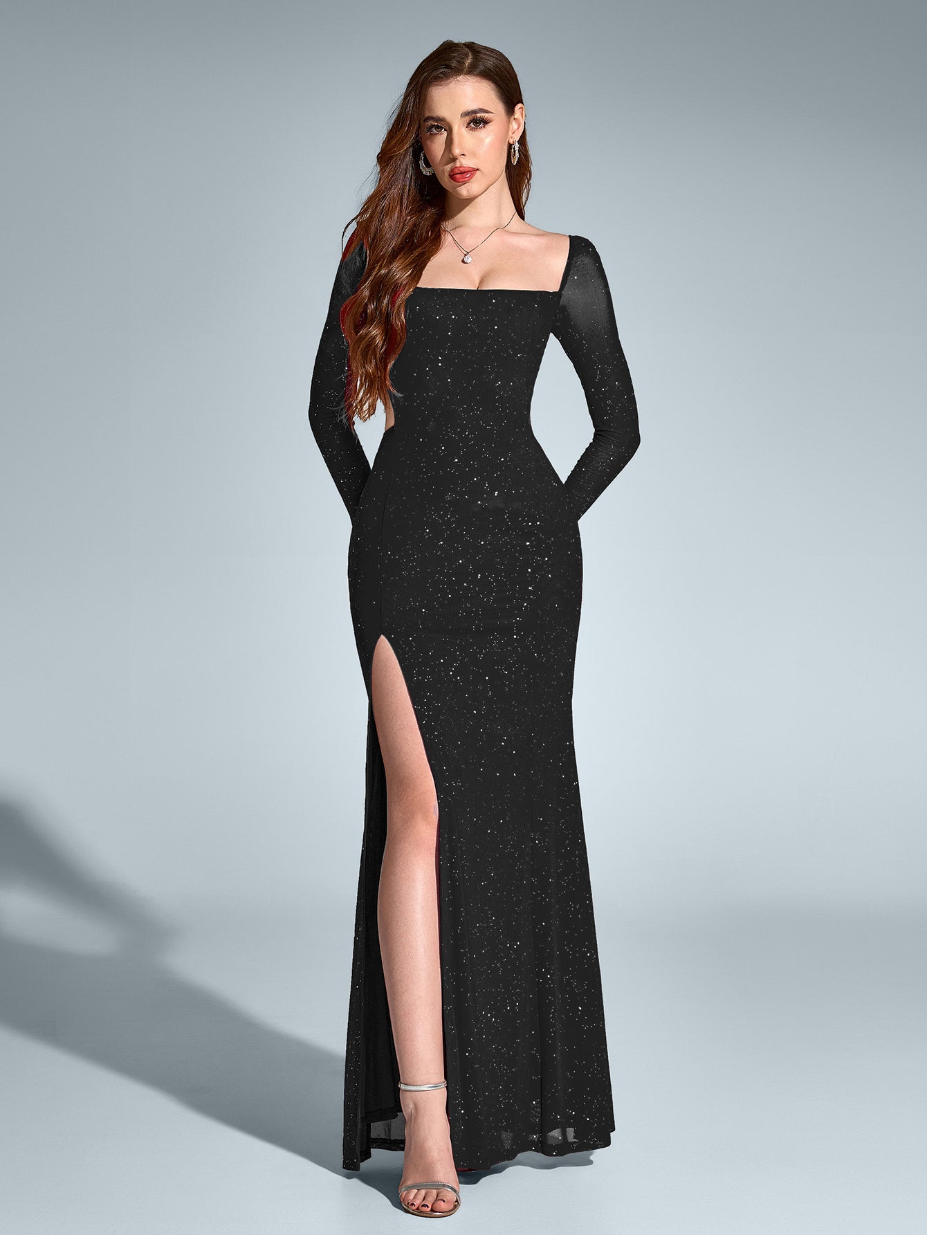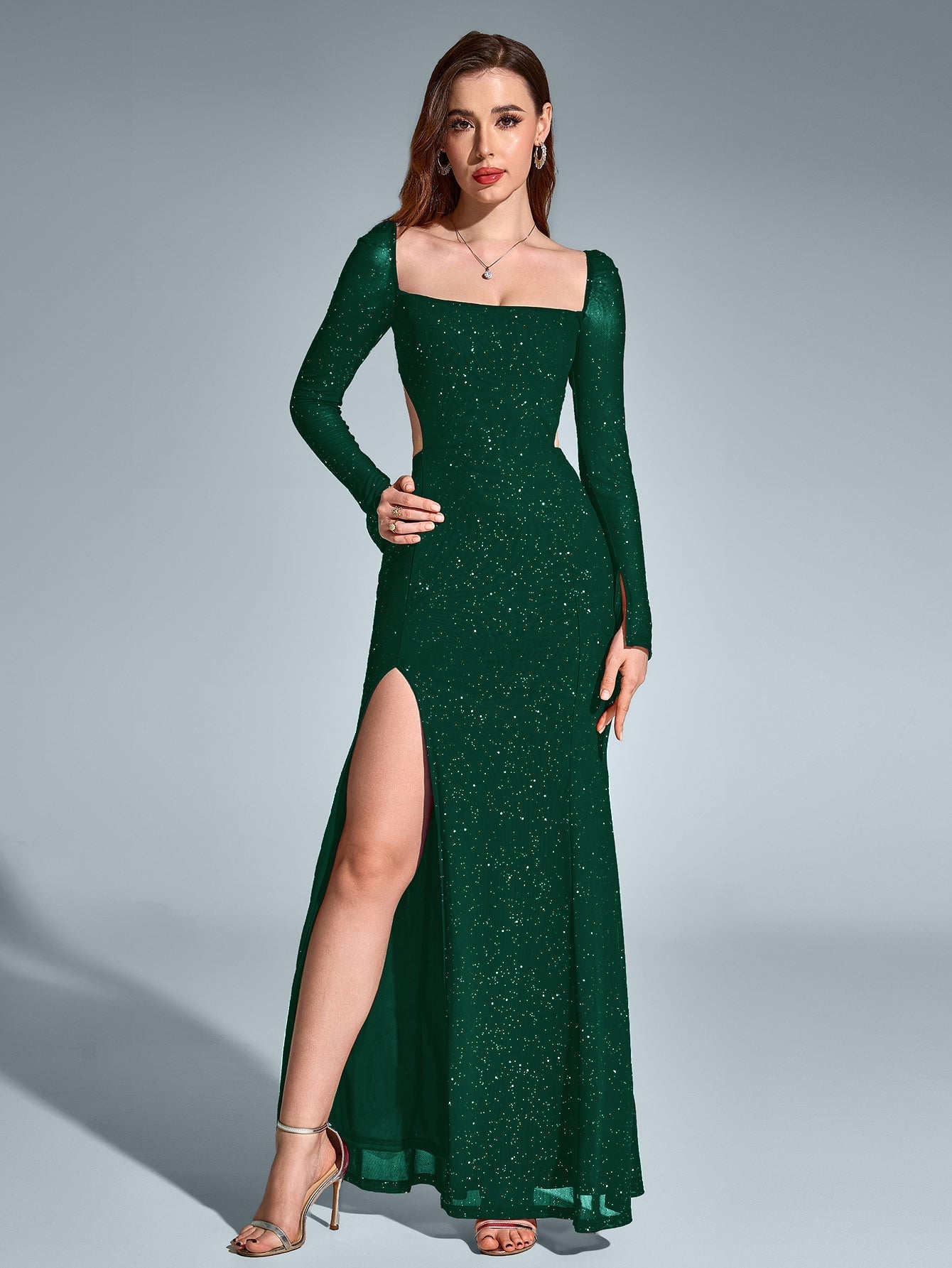Błyszcz przez całość nadal w Sukience Maxi z Wycięciem i Brokatem!